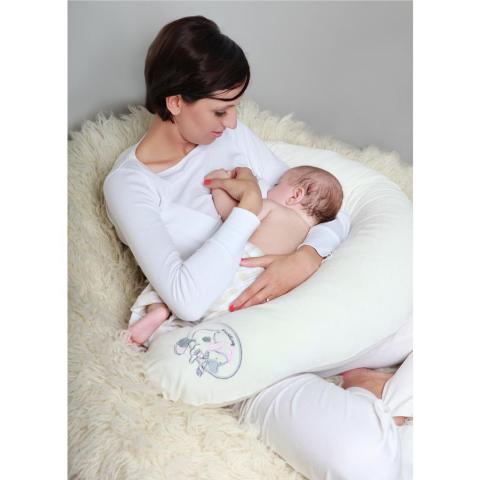 Univerzális velúr szoptatós párna, kivarrt pamut nyuszikával díszítve. A borítás cipzáros, levehető és mosható. Összetétel: 80% pamut, 20% poliészter, bélés – antiallergén anyag. Belső kerület hossza: 170 cm, magasság: 16 cm.